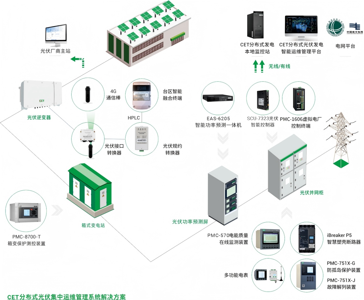 CET分布式光伏集中運維管理系統解決方案,采用源網荷儲深度協同理念而設計,通過對分布式光伏、逆變器、風電、儲能、充電樁、電能質量治理設備等柔性資源進行運行監測、控制策略生成和下發 , 實現分布式光伏的全面監控,提升配電臺區光伏就地消納能力,支撐配電網安全穩定運行 。 方案可與電網電能質量監測系統、調度系統交互,通過云邊協同快速響應臺區級、配網級的分布式光伏管控需求。